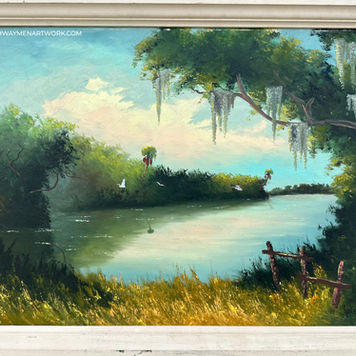 One day, Hair asked Hezekiah how long it took him to finish a painting, and when he replied that it took two to three hours, Alfred showed him how to paint faster. He would go to Alfred’s house to watch him and the other painters create their landscapes. Once he returned home, he would immediately try to replicate what they were doing. When Hezekiah experienced selling paintings for $25 or $35, good money back then, he was hooked, and started painting for a living.